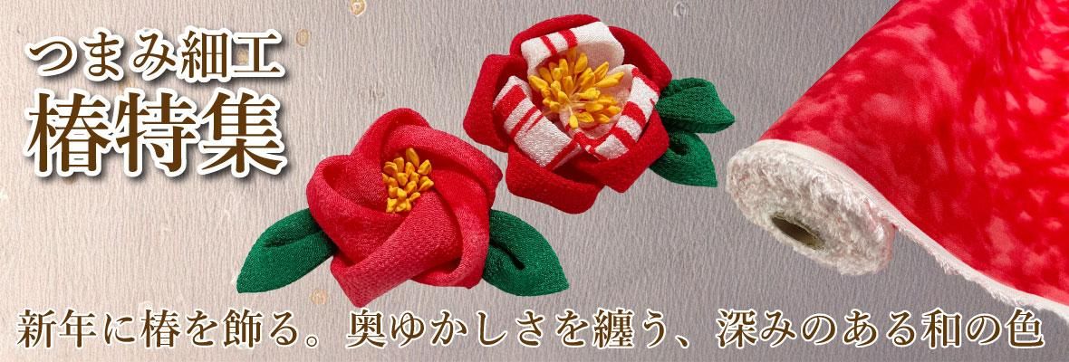 大胆な赤と白をベースにした椿の簪や、淡い侘助風の椿の花束をつまみ細工で仕上げました。