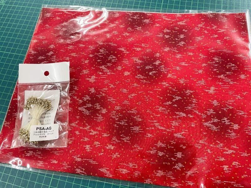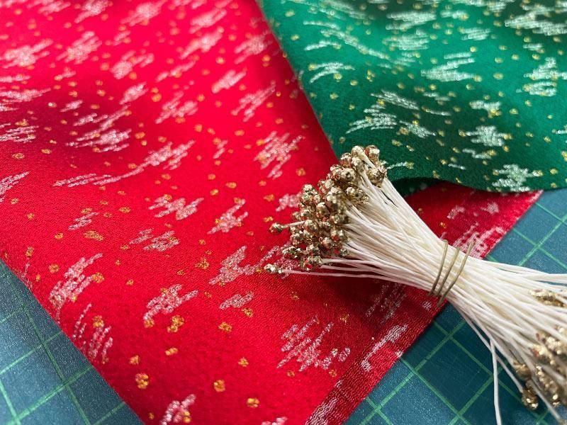 生地はキラキラのクリスマスカラーでつまみ細工用に使える花芯(ペップ)付き!